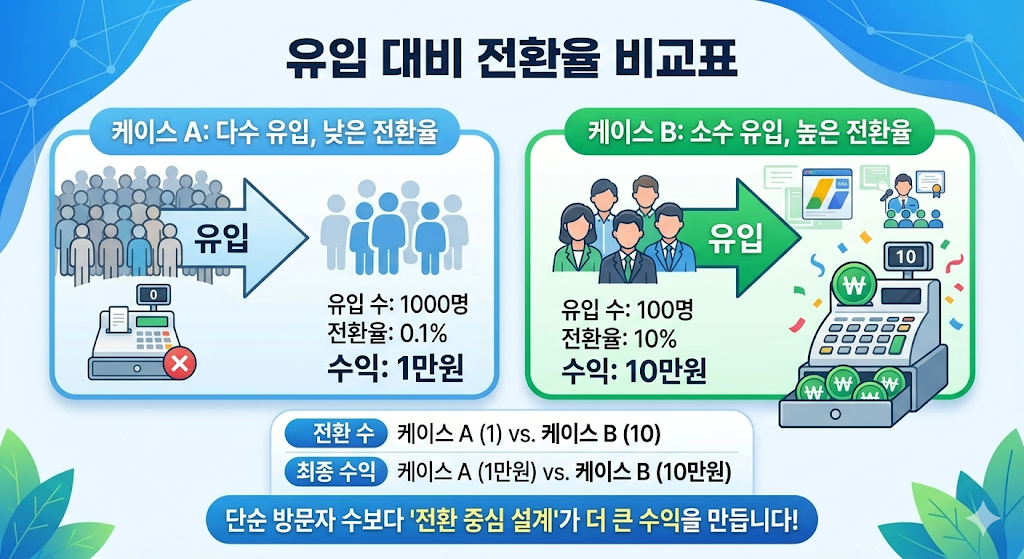 예를 들어 방문자 1000명이 들어와도 전환율이 0이면 수익은 0입니다. 반대로 100명만 들어와도 전환율이 높으면 더 큰 수익이 발생합니다.
