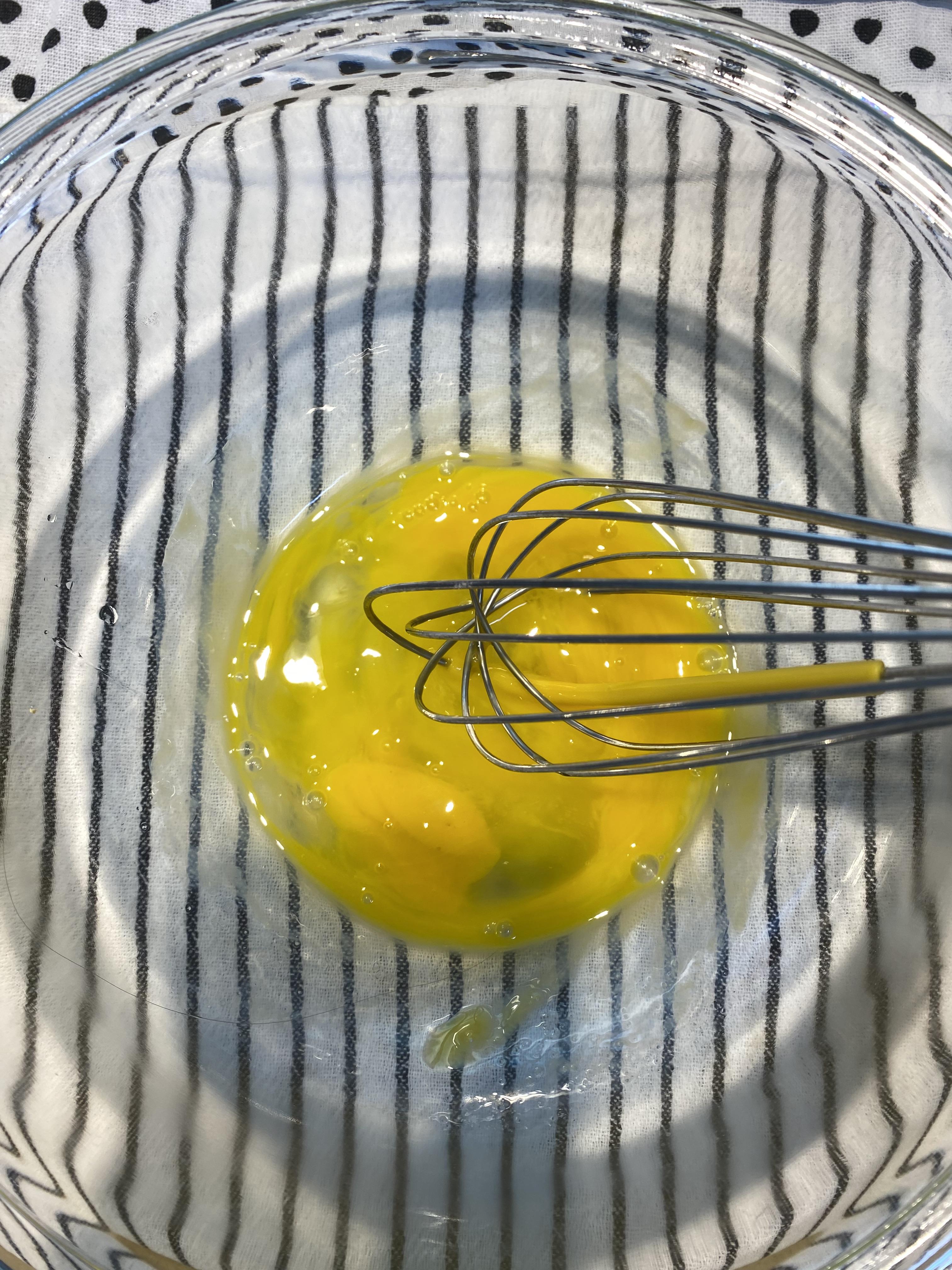 실온 상태의 달걀을 볼에 넣고 거품기로 살살 풀어줍니다.