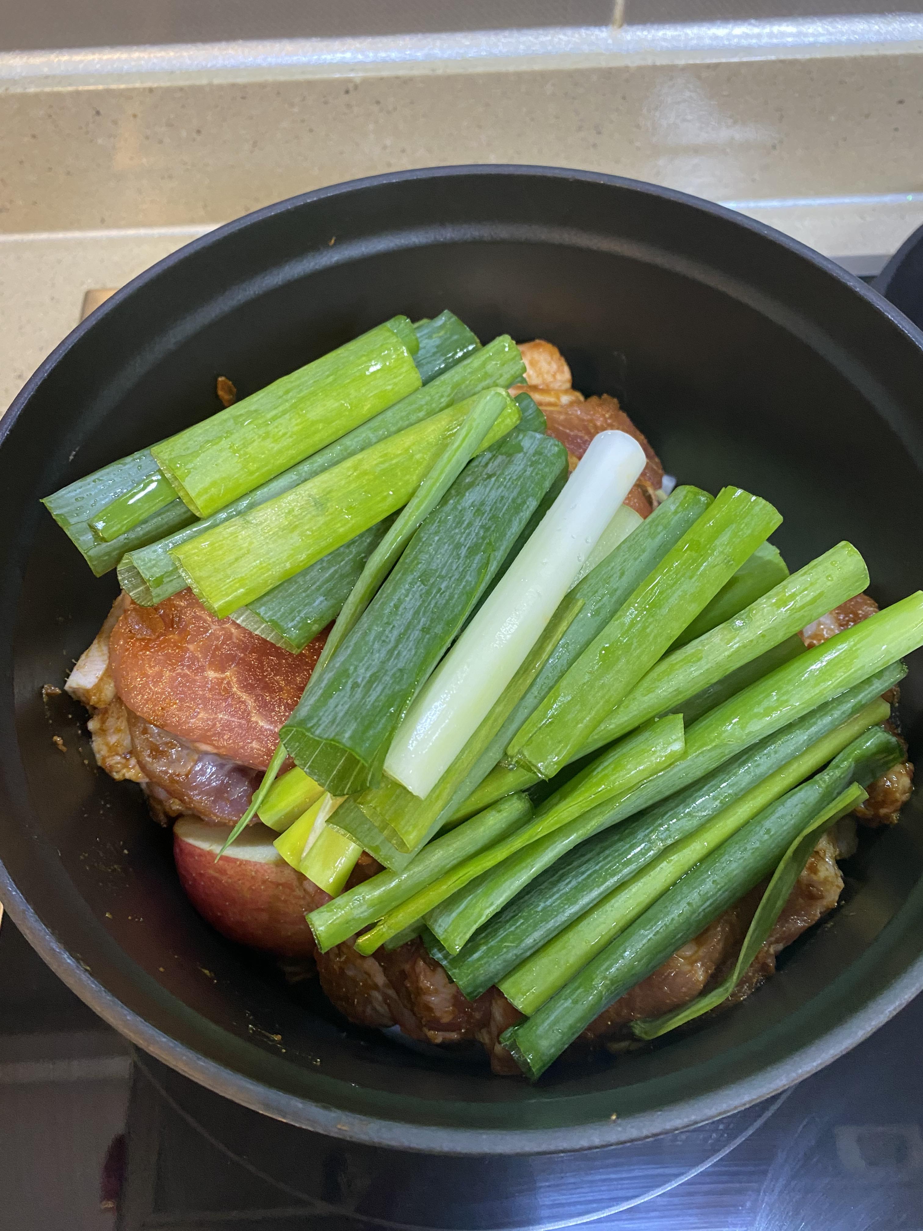 돼지 앞다리살 1kg, 무 4분의 1, 양파 중 1개, 사과 1개(또는 반개), 대파 1줄, 된장