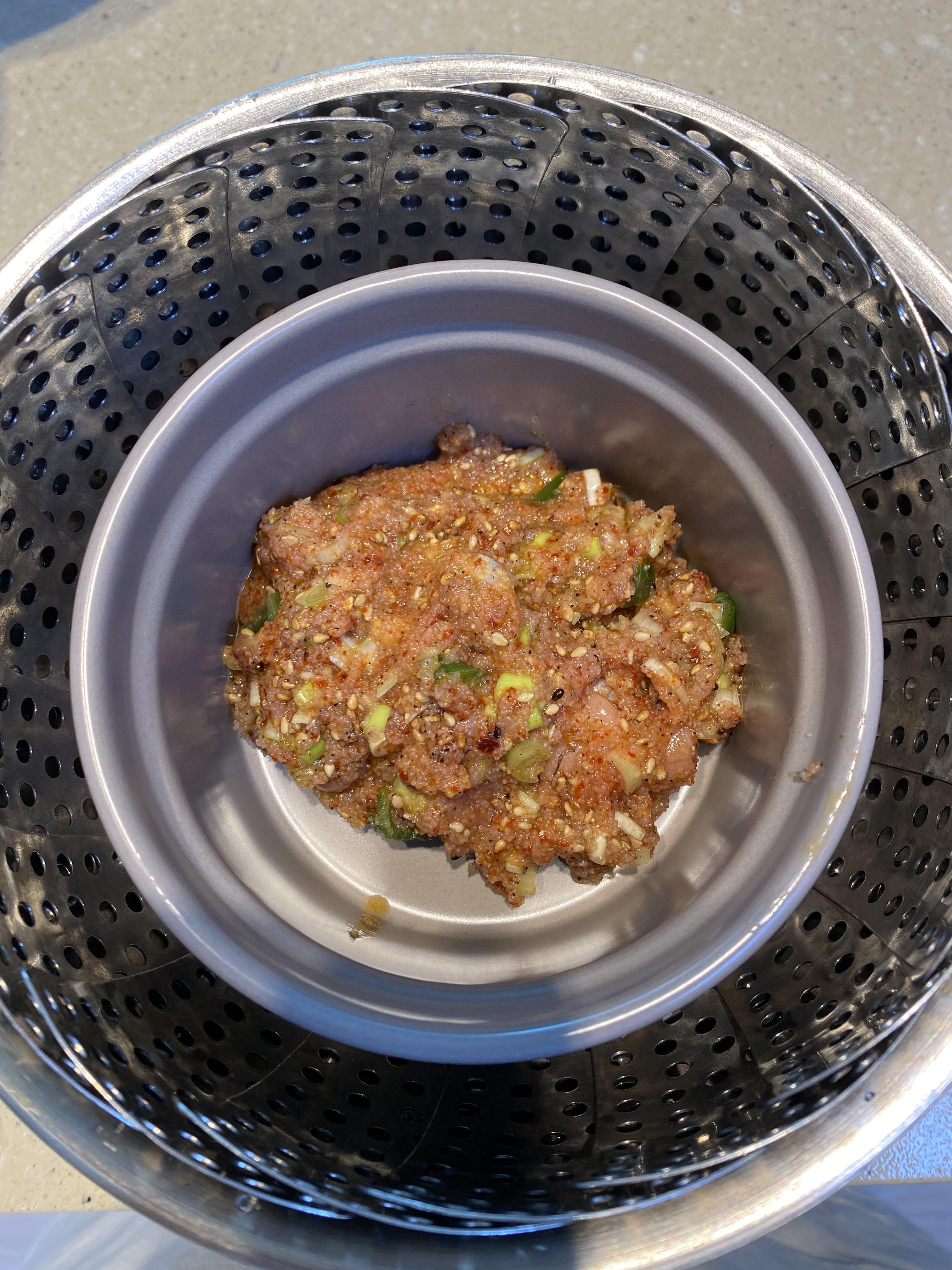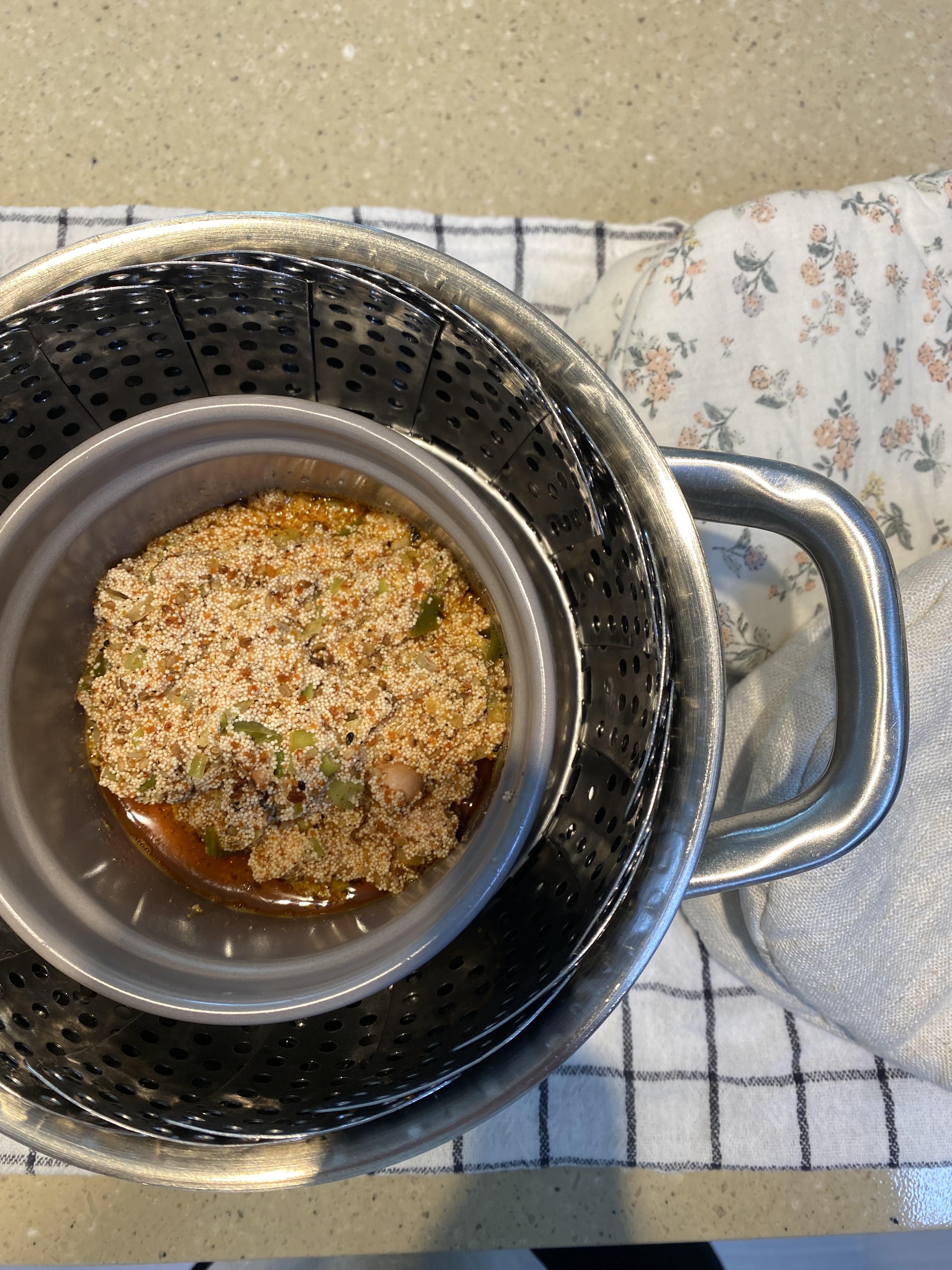 이제 중탕용 그릇에 명란젓 섞은 걸 옮기고 찜통에 약불에 15분 쪄줍니다.