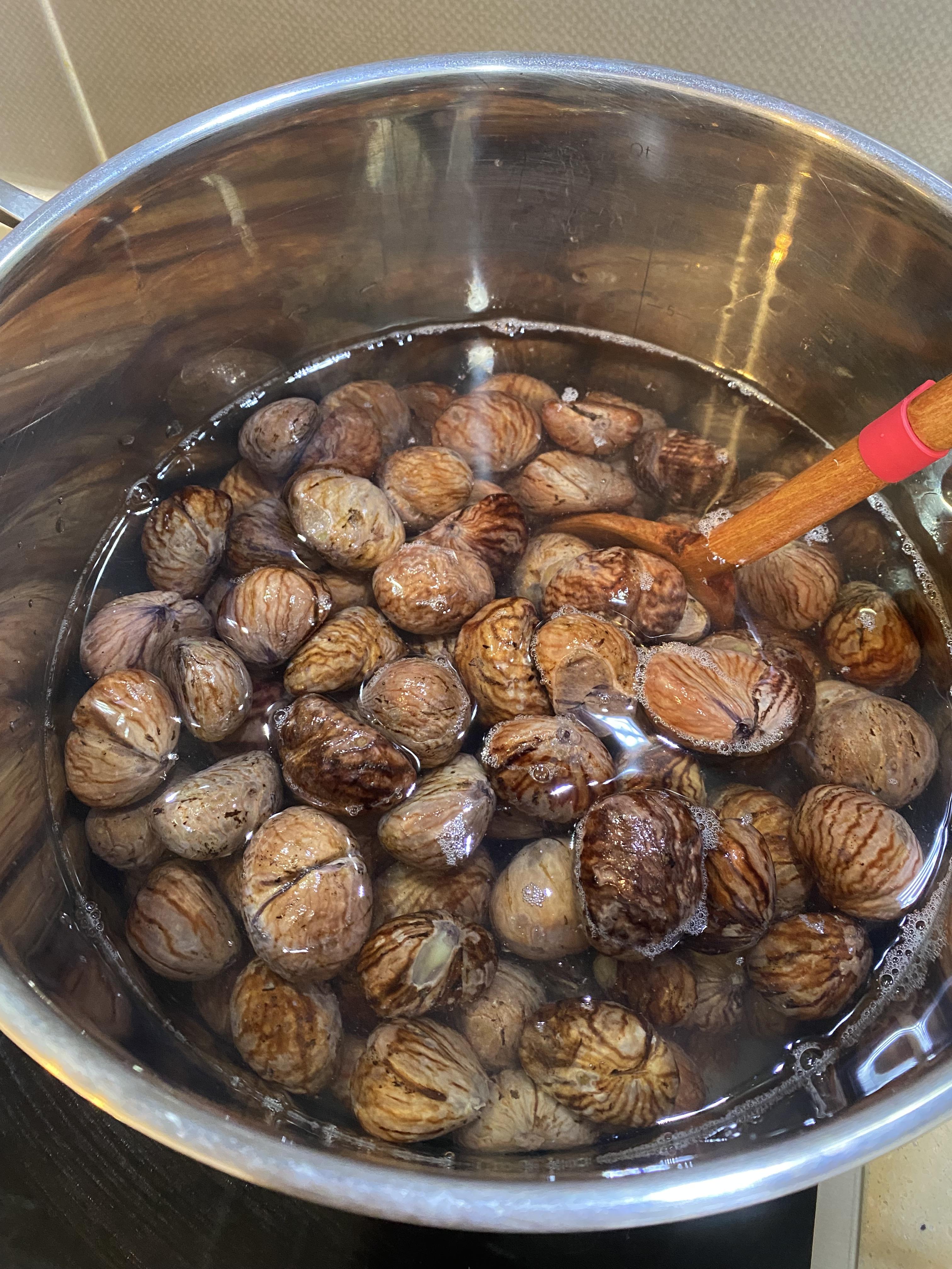 베이킹 소다 한 스푼을 넣고 밤이 잠길만 한 물의 양으로 바글바글 끓여줍니다.