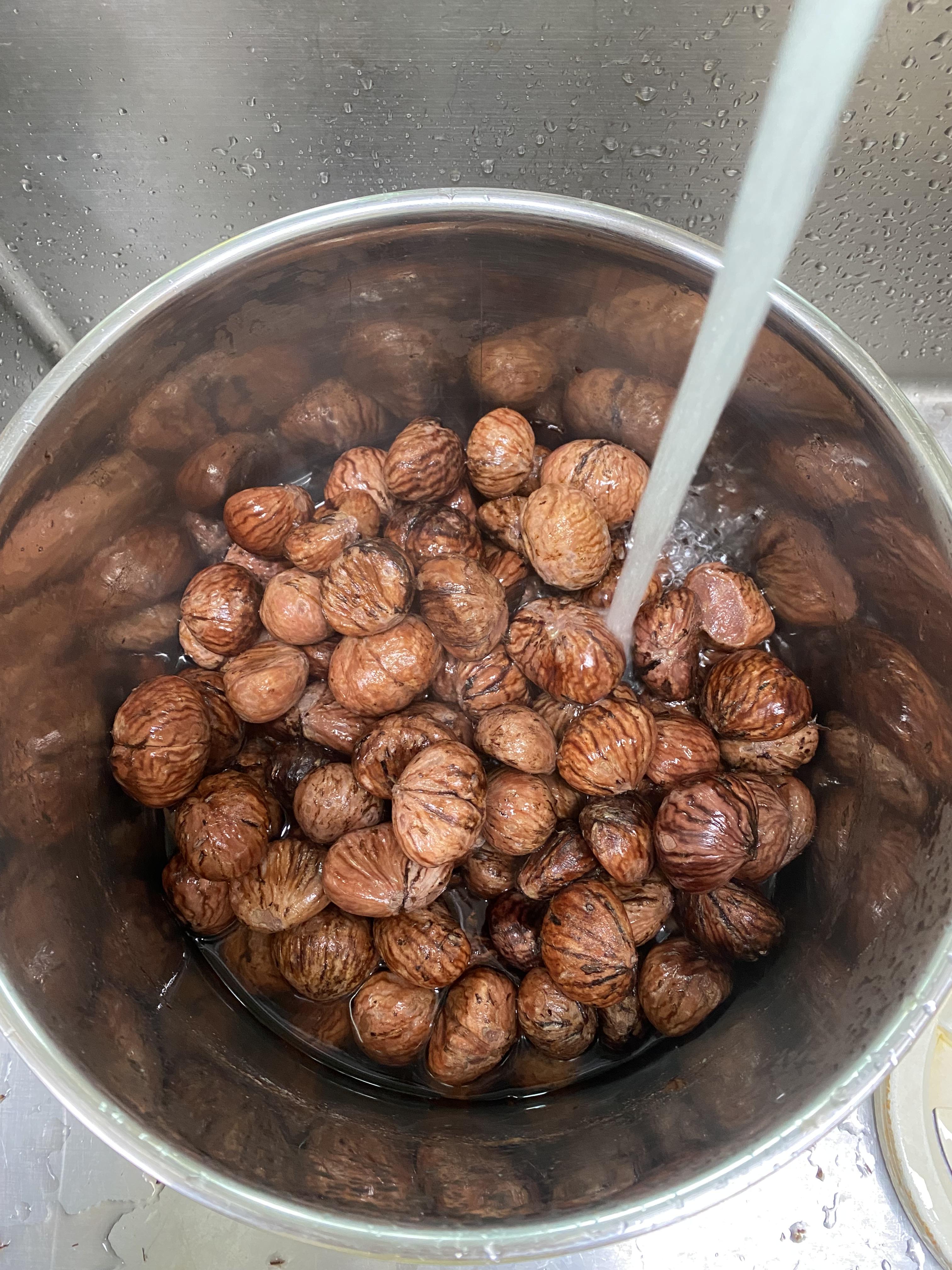 깨끗하게 헹군 후에 깐밤의 무게를 잽니다. 이 무게의 절반 양의 설탕을 계량합니다.