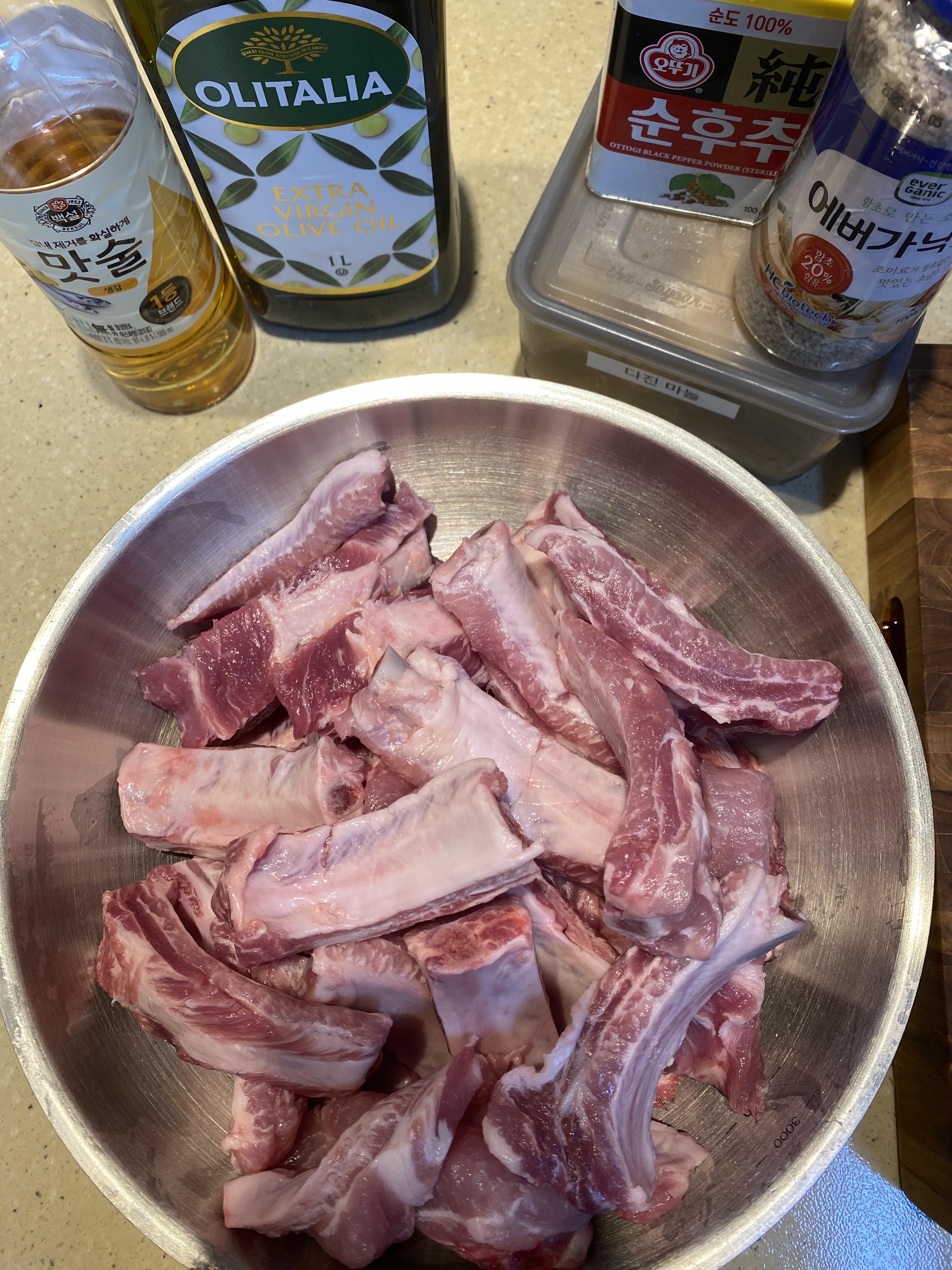 등갈비 1.5kg, 맛술, 올리브유, 소금, 후추, 다진마늘 2숟갈