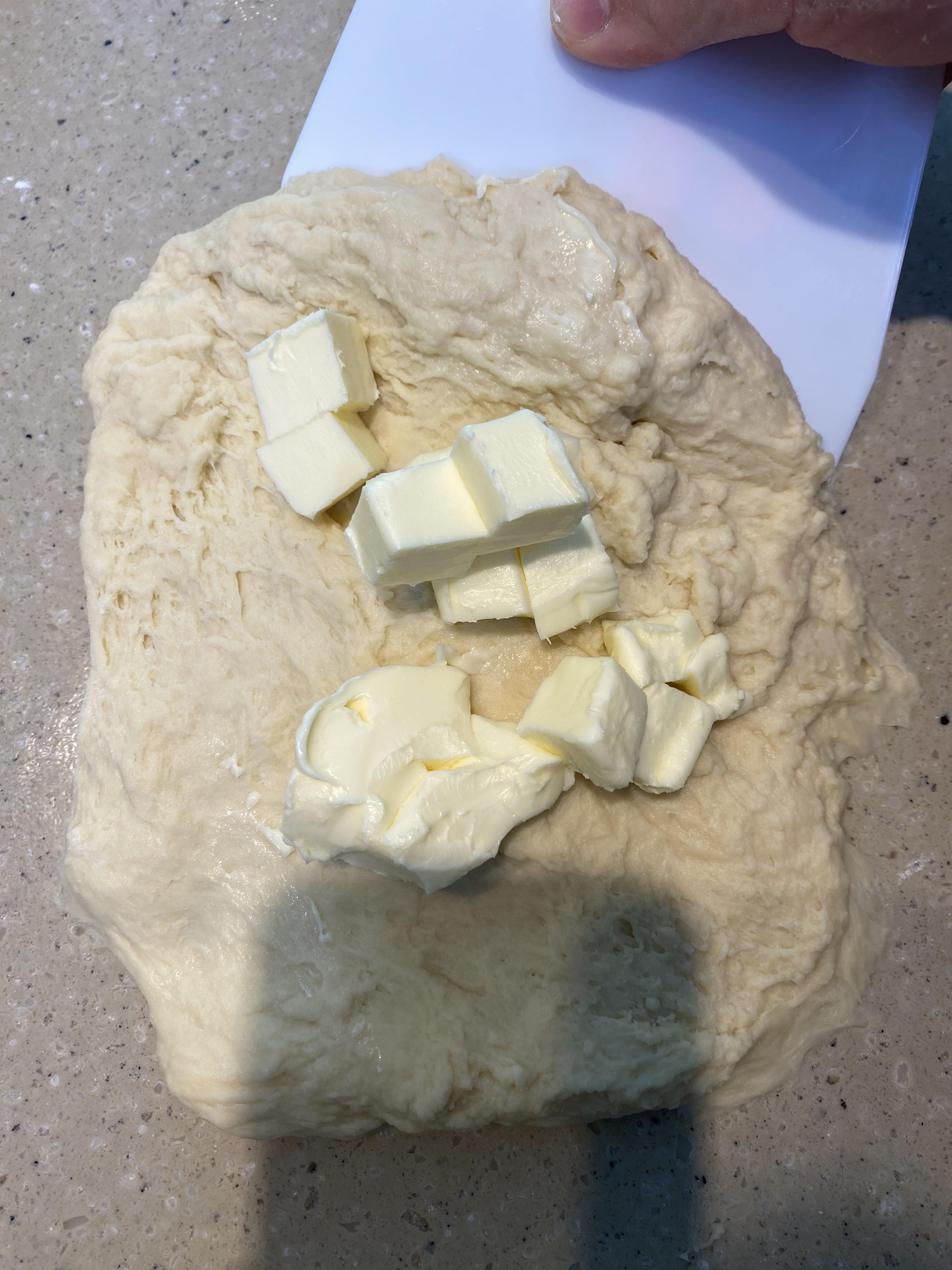 상온에 둬서 포마드 상태인 버터 50g을 반죽 위에 올리고 반죽을 덮어줍니다.